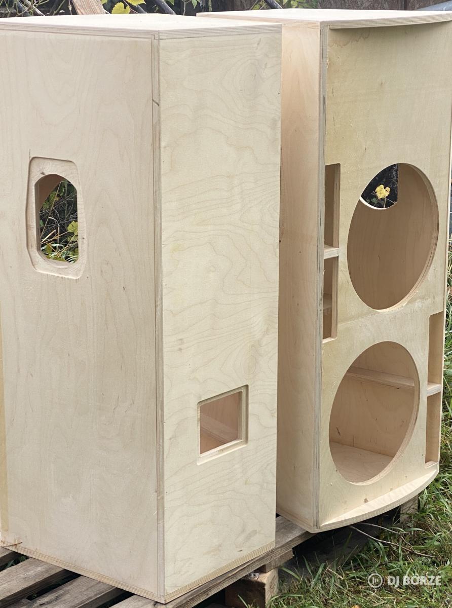 Eladó a képen látható nyers állapotban ez a két trapéz kialakítású, 18 mm első osztályú nyír rétegelt lemezből készült hangfalpár.