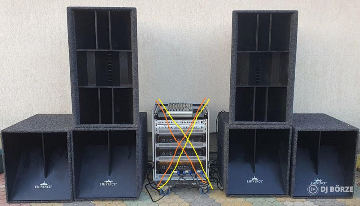 A subok tölcséres bandpas, 18" Eminence Kappa Pro, a tölcséres topokban 2-2db Eminence DELTA, és 2-2db Eminence PSD 2002 driverel a speciálisan kiképzett tölcsérek mögött. Két útban van a meghajtás,