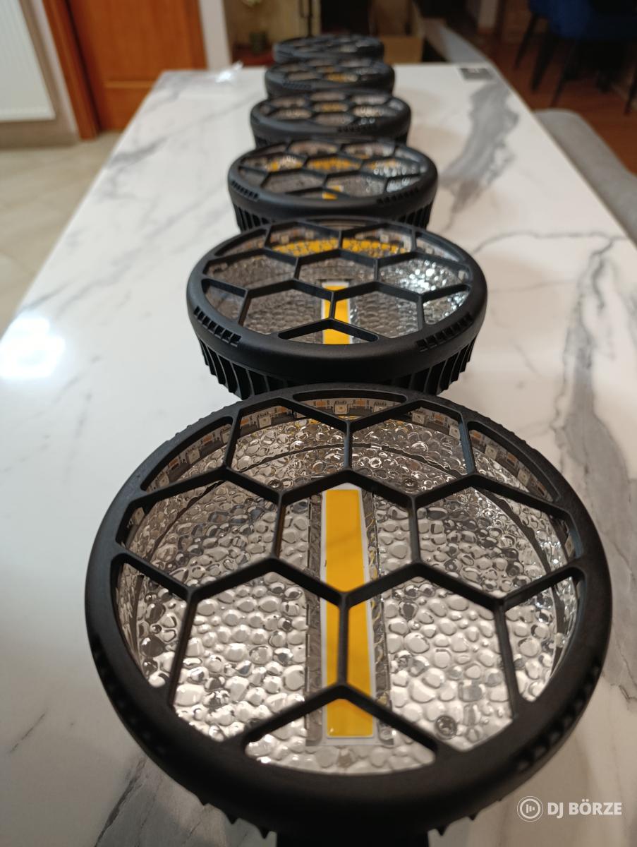 Fényforrás: 6 x 50 w arany fényű COB + 168 x 0,5 watt RGB Led