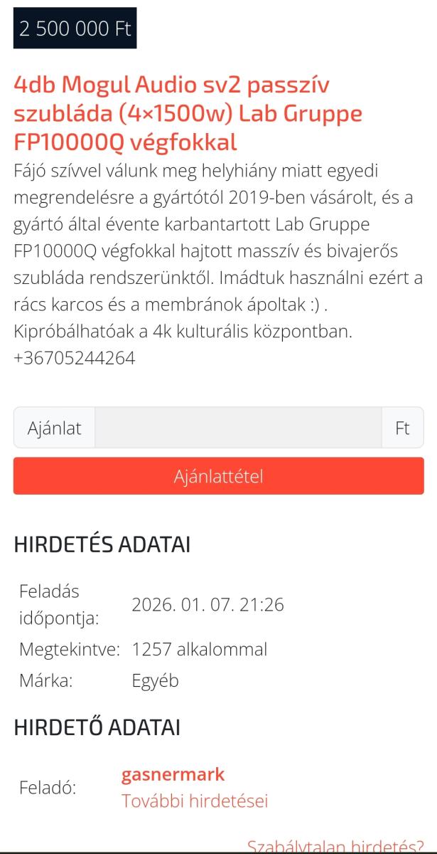 Ezzel a hirdetéssel legyen mindenki elővigyázatos, mert a helyszínen sok dolog ki tud derülni, mint pl, egy hangfalról két kerék le van szakítva, nagyon leharcolt az összes láda kívülről, két hangszóró más mint a többi, és hát a hangszórók sincsenek szép állapotban, némelyik már majdnem vaj színű a portól (ami nagy valószínűséggel nem jön már le) és az a nagylyukú rács miatt fontos lehet valakinek.