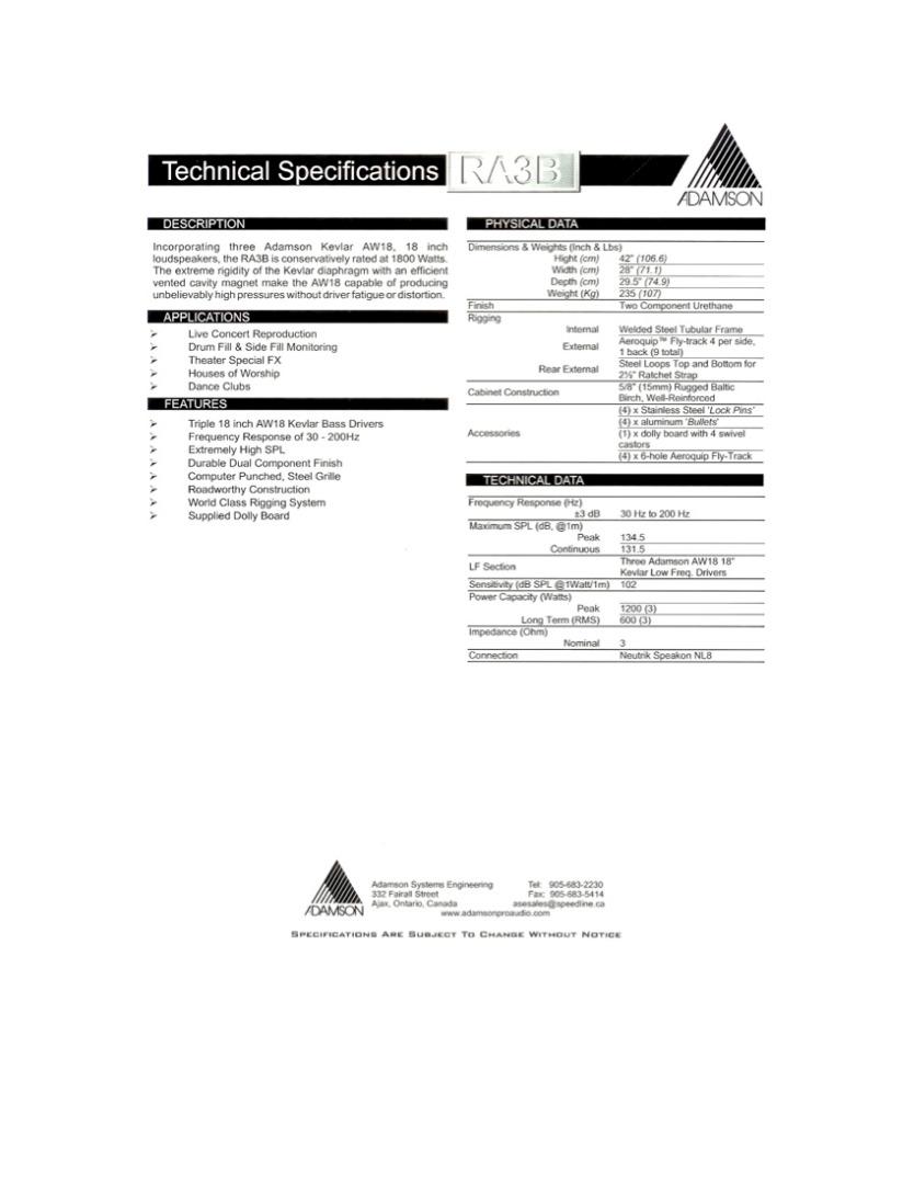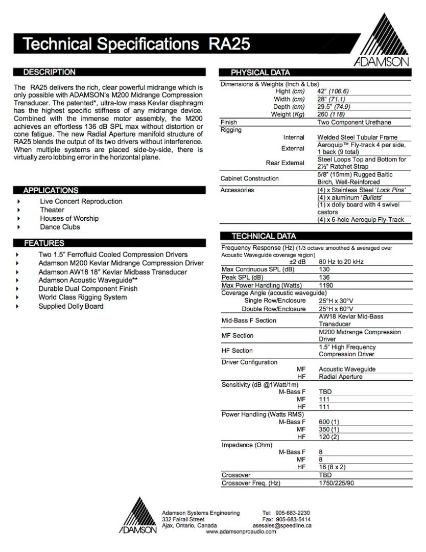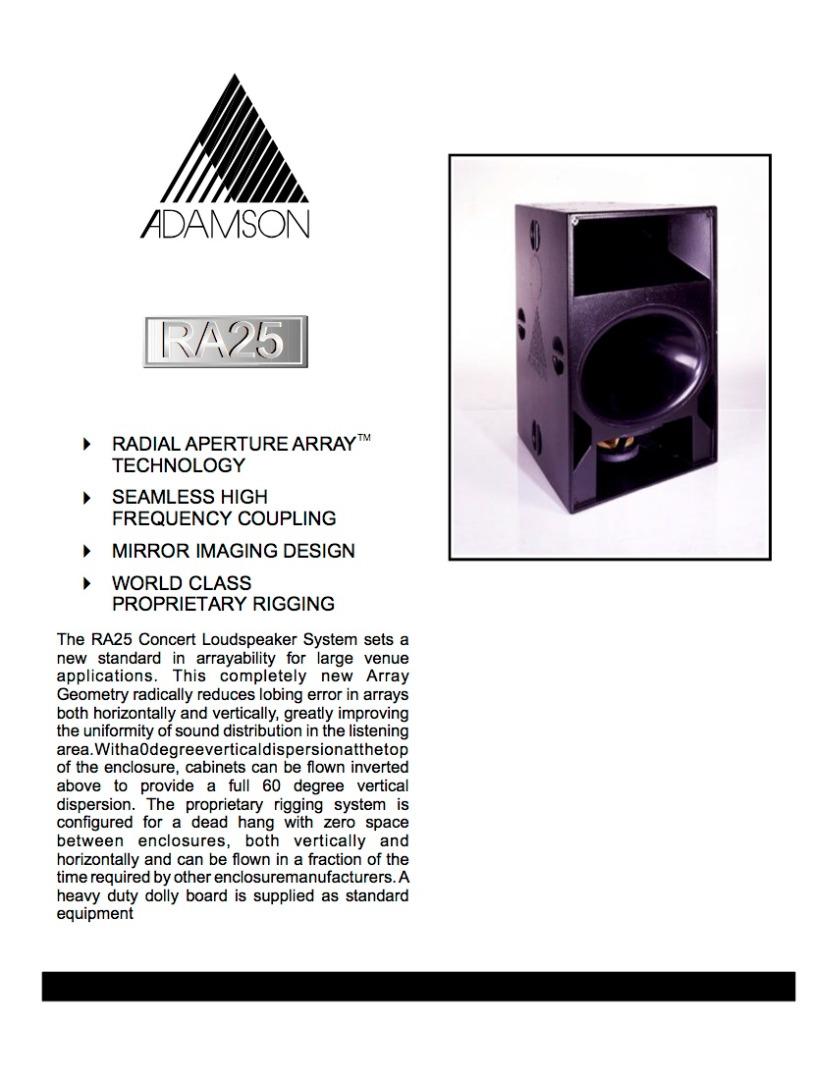 Eladó 12db Adamson RA25 Top és 8db RA3B Sub. Működésképtelen hangszórók: 6db AW18 és 1db Driver 6db PKN Audio XE5002 végfok BSS Soundweb 9088iis rendszervezérlő Klotz 8pol speakon kábelek 20db hangfal ára: 3.000.000 Ft Végfokpark/kábelek ára: 2.500.000 Ft Egyben: 5.000.000 Ft e-mail: [email protected] tel: 0630/ 714 76 56