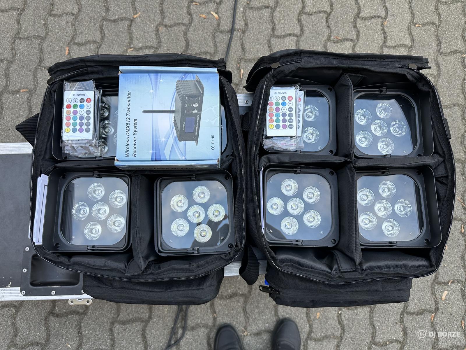 Eladó 8 db Új, akkumulátoros PAR lámpa( falszínezős, surlófény ) Technikai specifikáció: Szín: fekete Anyag: öntött alumínium Feszültség: AC110V–240V, 50/60Hz Teljesítmény: 80W Fényforrás: 6 db 18W-os 6 az 1-ben LED (RGBWA+UV) Működési módok: automata, hangvezérelt, master-slave, DMX DMX csatornák: 6CH / 10CH Protokoll: DMX512 szabvány Fényszög: 25° Akkumulátor kapacitás: 8800 mAh Üzemidő: 4 óra maximális fényerővel 6-8 óra automata módban 18+ óra egyszínű módban Töltési idő: 4-6 óra Vezérlés: infravörös távirányító, dmx kábelen keresztül, Wireless/vezeték nélküli dmx Tartozékok: - 4 db infra távirányító - 4 db töltőkábel, doboz - használati utasítás - 1 db hordtáska(4 db tárolására alkalmas) Igény esetén a képen látható vezérlőt is tudom hozzád adni( + 10 000 Ft ). Személyesen átvehető és kipróbálható Újpesten, vagy előre utalással foxposton keresztül tudom küldeni. 4 db lámpa+táska és tartozékok: 180 000 Ft 8 db lámpa+táska és tartozékok: 340 000 Ft