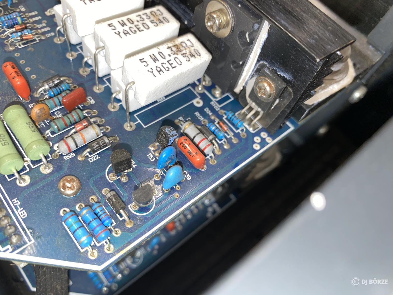 -prémium kínai és japán alkatrészek, oldalanként 10 db (Mjl21193, Mjl21194) + 12 db (MJ15024, MJ15025) nagyteljesítményű tranzisztor dolgozik +-70V alacsony teljesítményen és +-140V nagy teljesítményen.