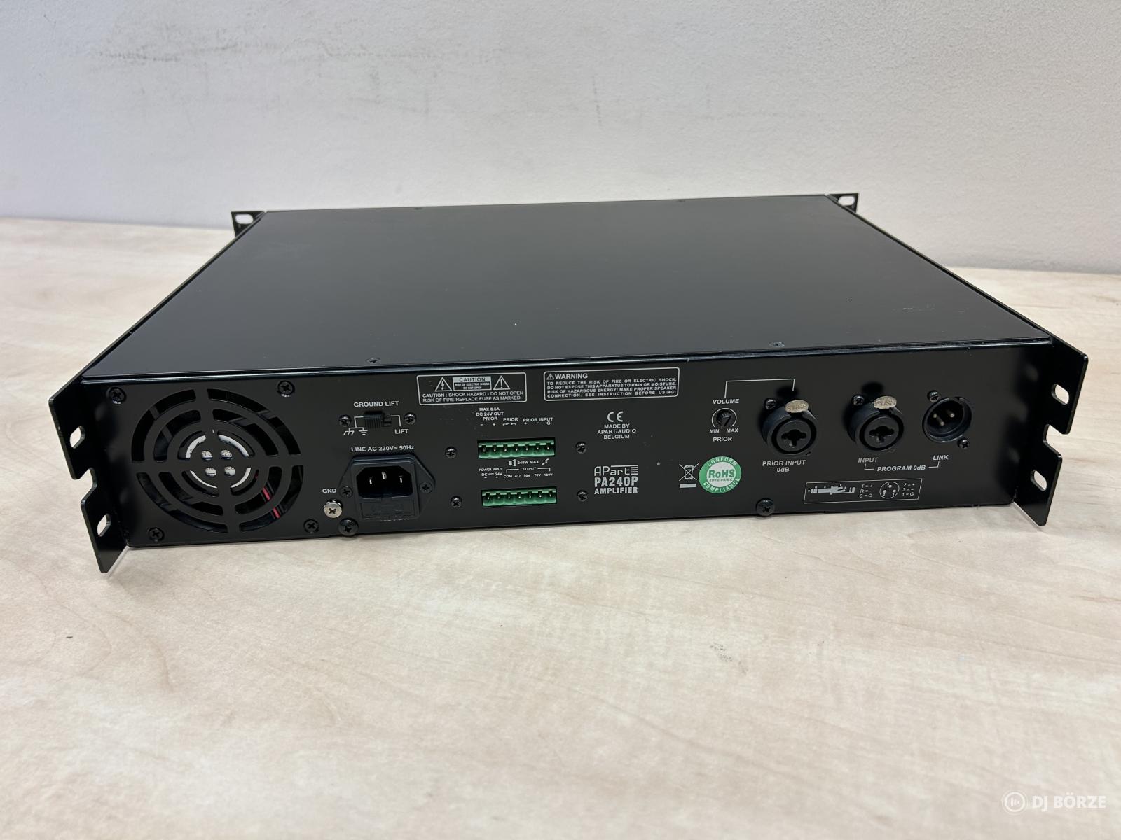 APart PA240P típusú, ipari kivitelű Public Address (PA) erősítő, amely kifejezetten folyamatos üzemre és nagyobb terhelésre lett tervezve. Megbízható választás üzleti és ipari környezetbe, ahol stabil hangosítás szükséges.