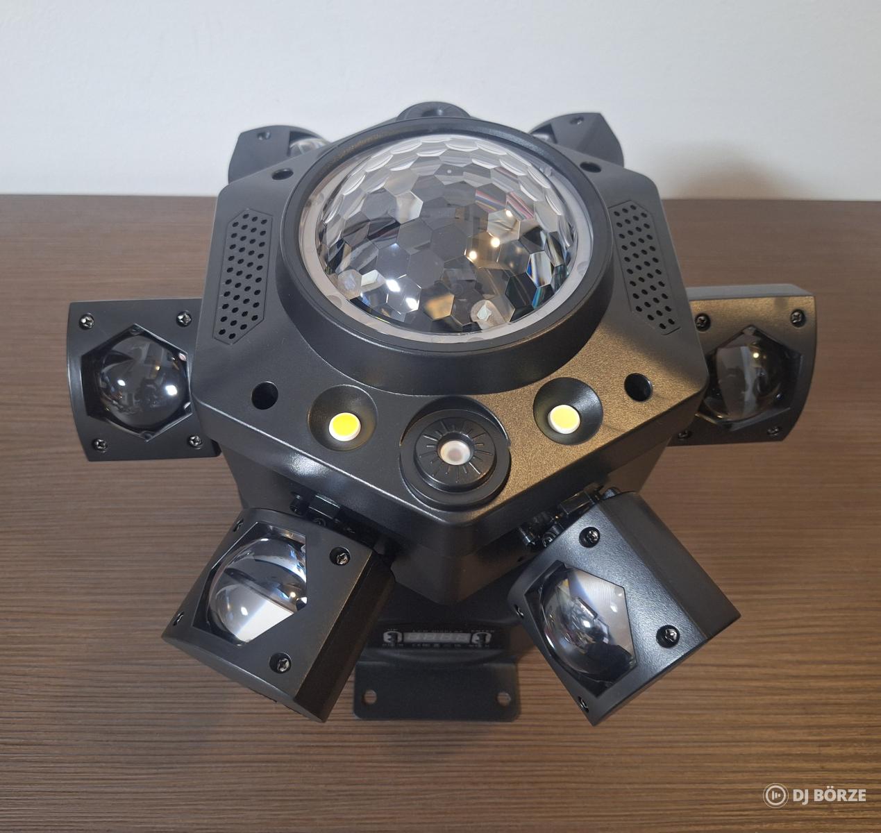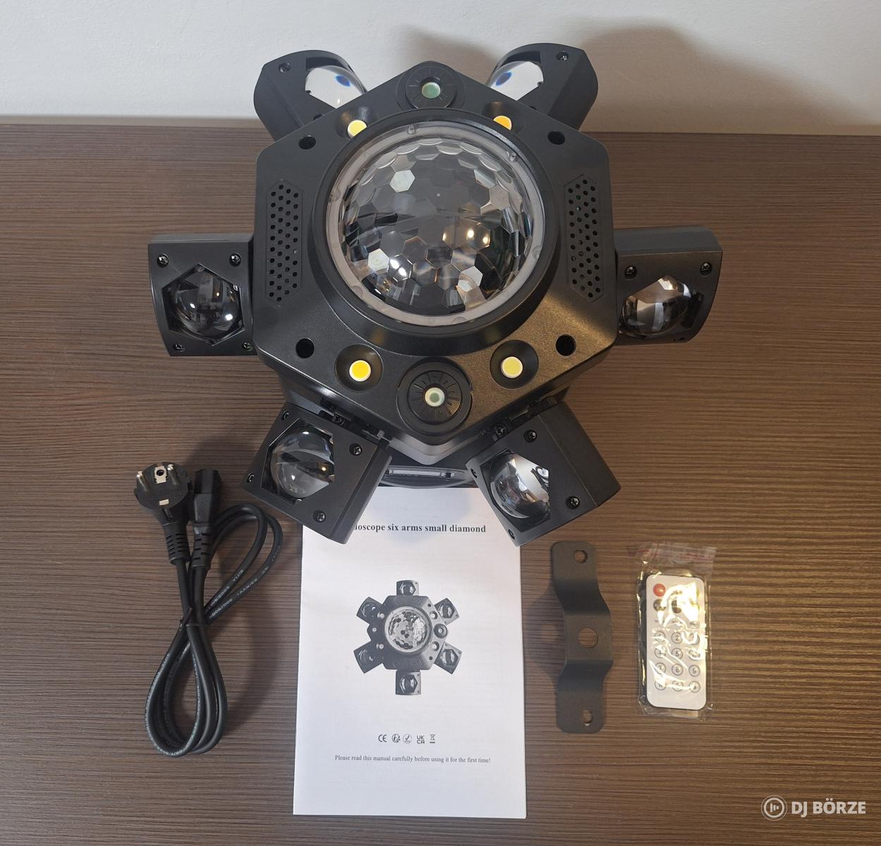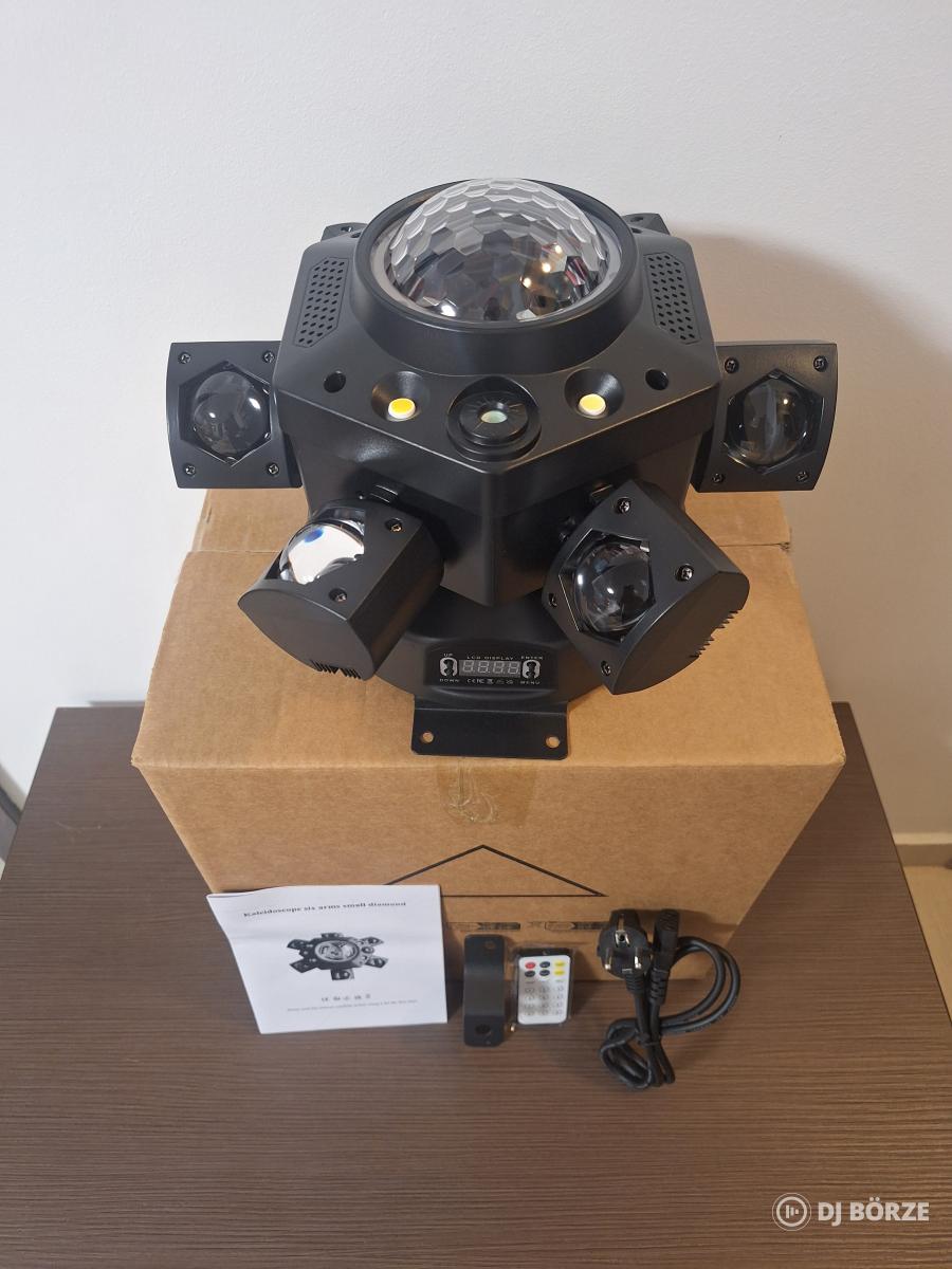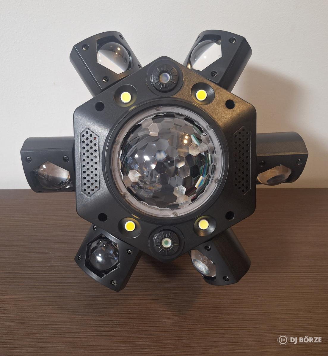 120 watt összteljesítményű, kompakt méretű, 6 karú, látványos, forgó fejű fényeffekt, lézerrel, stroboszkóppal, wash, beam és magic ball effektekkel
