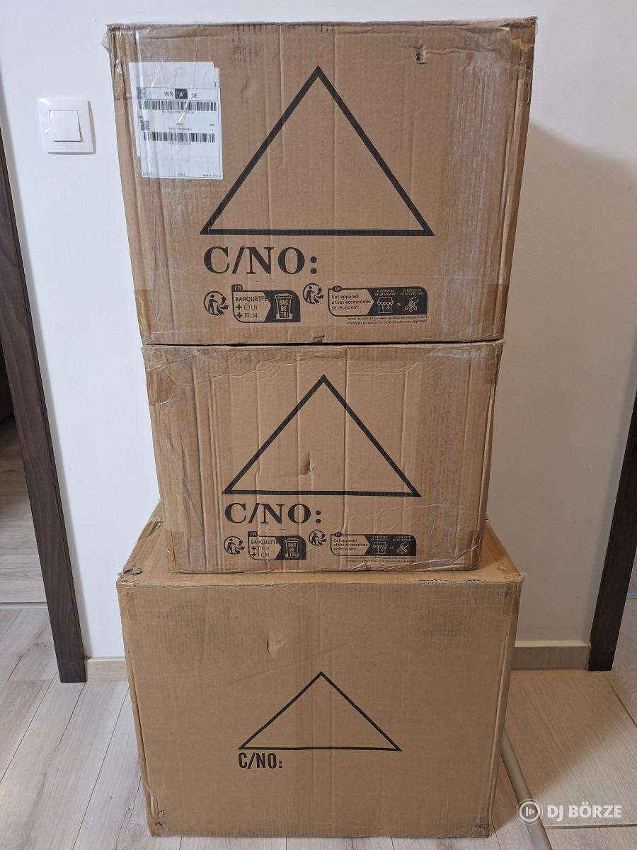 tartozékok: powercon tápkábel, 2 db omega kampó, használati utasítás