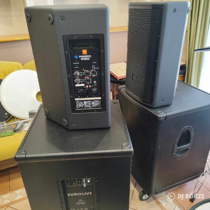 2 db aktív top: JBL PRX 812W, egyenként 1500W, huzattal.