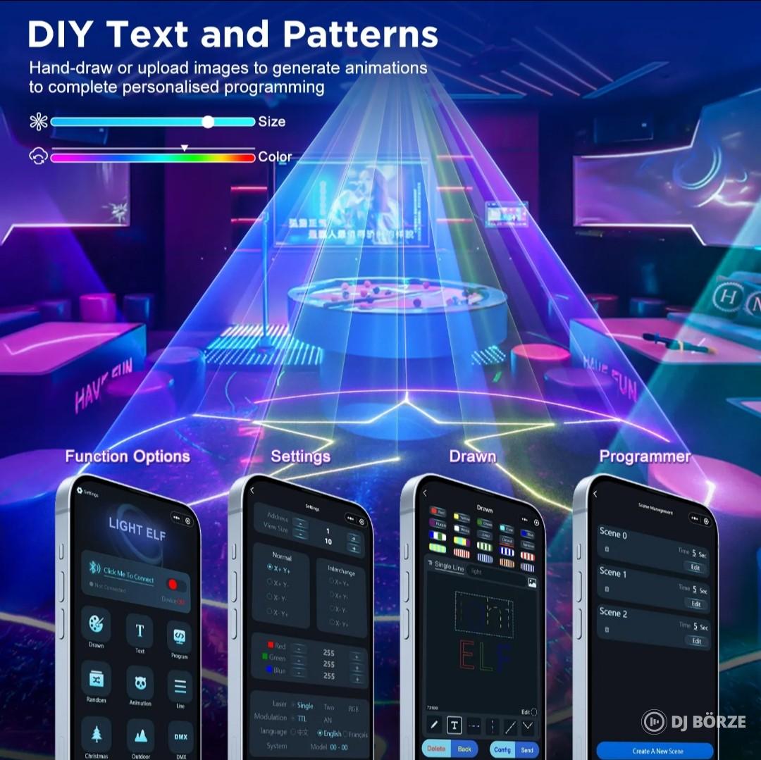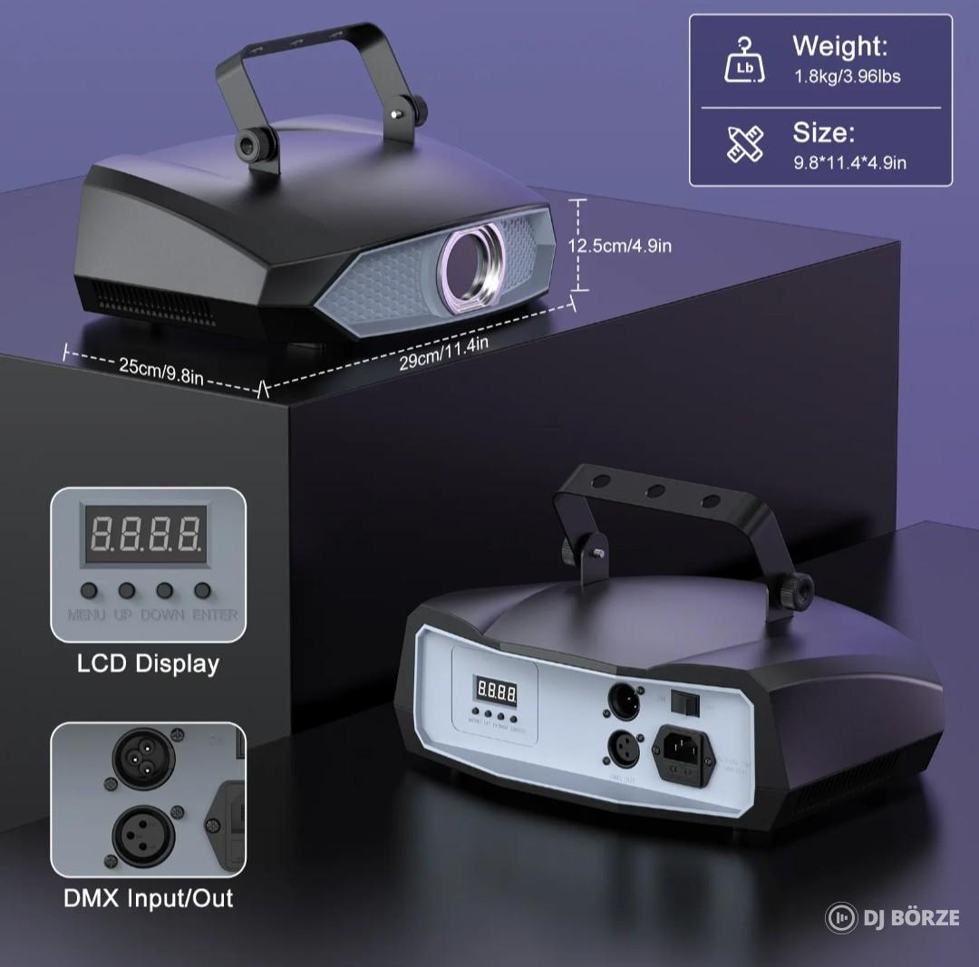 applikációval egyszerűen vezérelhető, egyedi ábrák, szövegek kivetítése, logo feltöltések, beépített animációk, egyedi effektusok, állítható betűtipusok, 20 szerkeszthető jelenet, előre beállított látványelemek