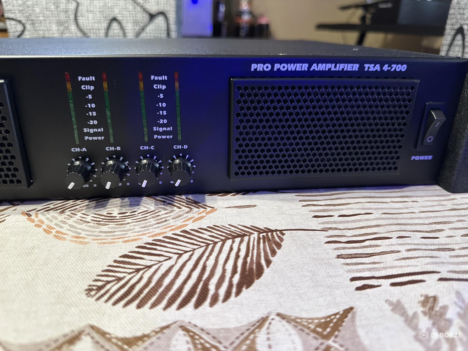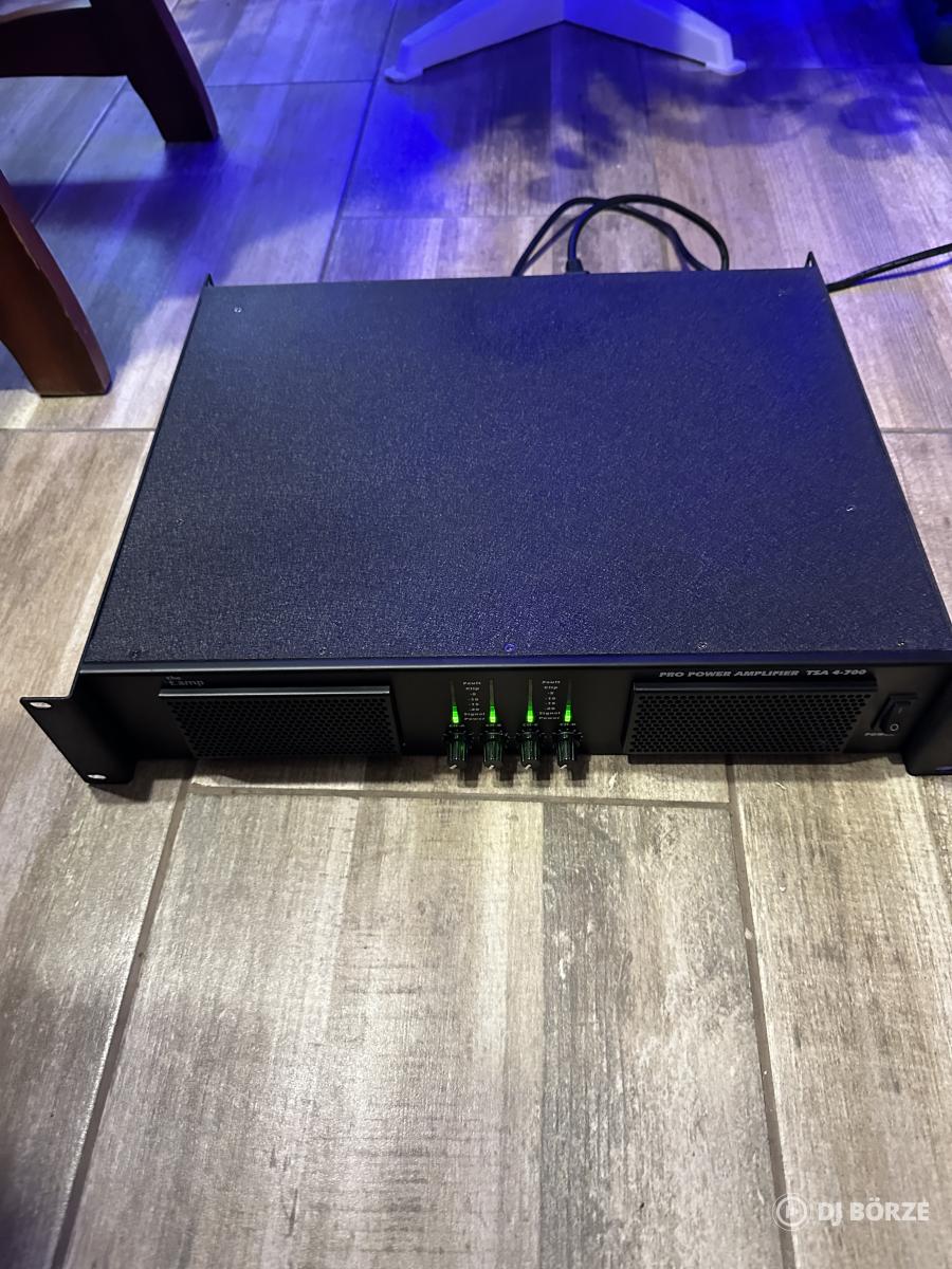 Eladó egy újszerű állapotban lévő the t.amp TSA 4-700 végfok. Bármikor kipróbálható, tesztelhető. Esetleges beszámítás is lehetséges. Adatok 4x 490 W / 8 Ohm 4x 810 W / 4 Ohm 4x 930 W / 2 Ohm 2x 1600 W / 8 Ohm (híd mód) 2x 1800 W / 4 Ohm (híd mód) XLR bemenetek és kimenetek Hangszóró Twist kimenetek Védő áramkörök: hanglimiter, hőmérséklet- és rövidzárlatvédelem Méretek: 488 x 370 x 97 mm Méret: 19" / 2 RU Súly: 10,7 kg
