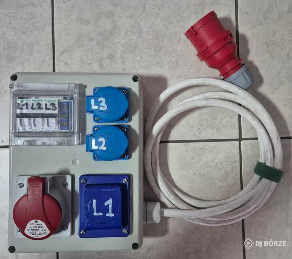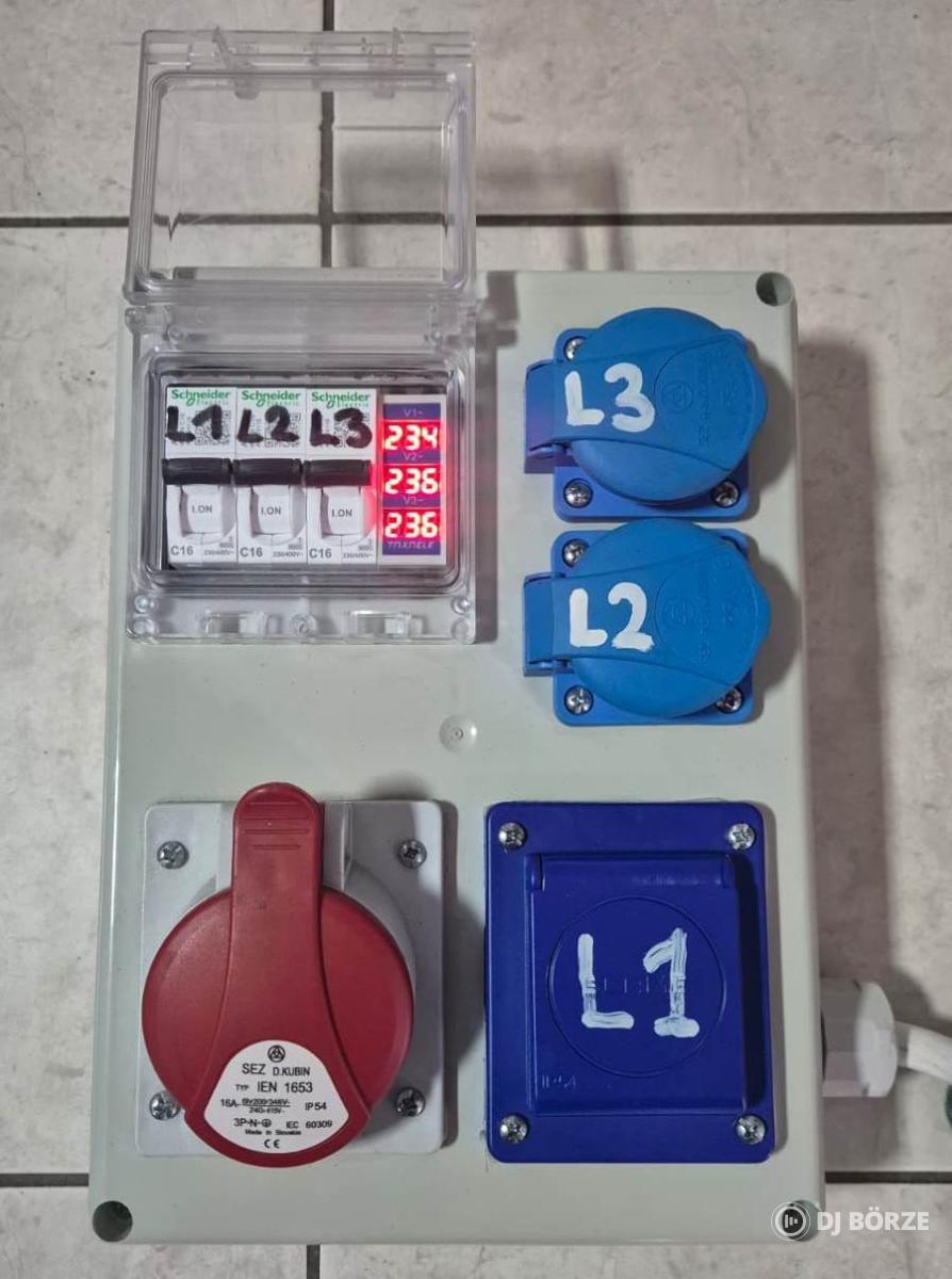 - 3x16 A lengő dugvilla - 5x2.5 mm2 MT kábel, 2 méter - 3db C16A kismegszakító - fázisonkénti feszültség kijelző