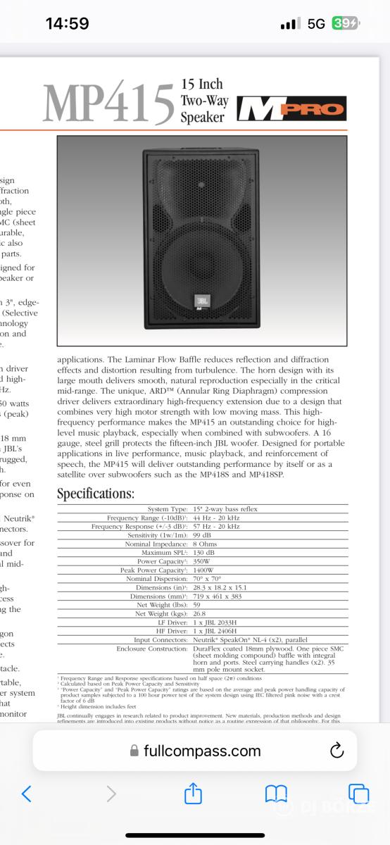 Eladó kettő darab Jbl mpro 415 típusú hangfal ! A hangfal szép állapotú , szinte karcmentes. Hangszórói gyáriak , javítva nem voltak es tökéletesen működnek !! Nem összekeverendő a gagyi jrx sorozattal vagy a kisebb mp215 típussal !! Teljesen más hangszóró készlettel rendelkezik !