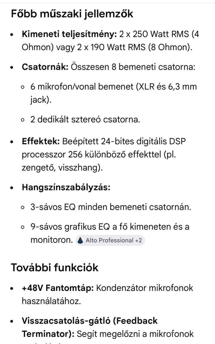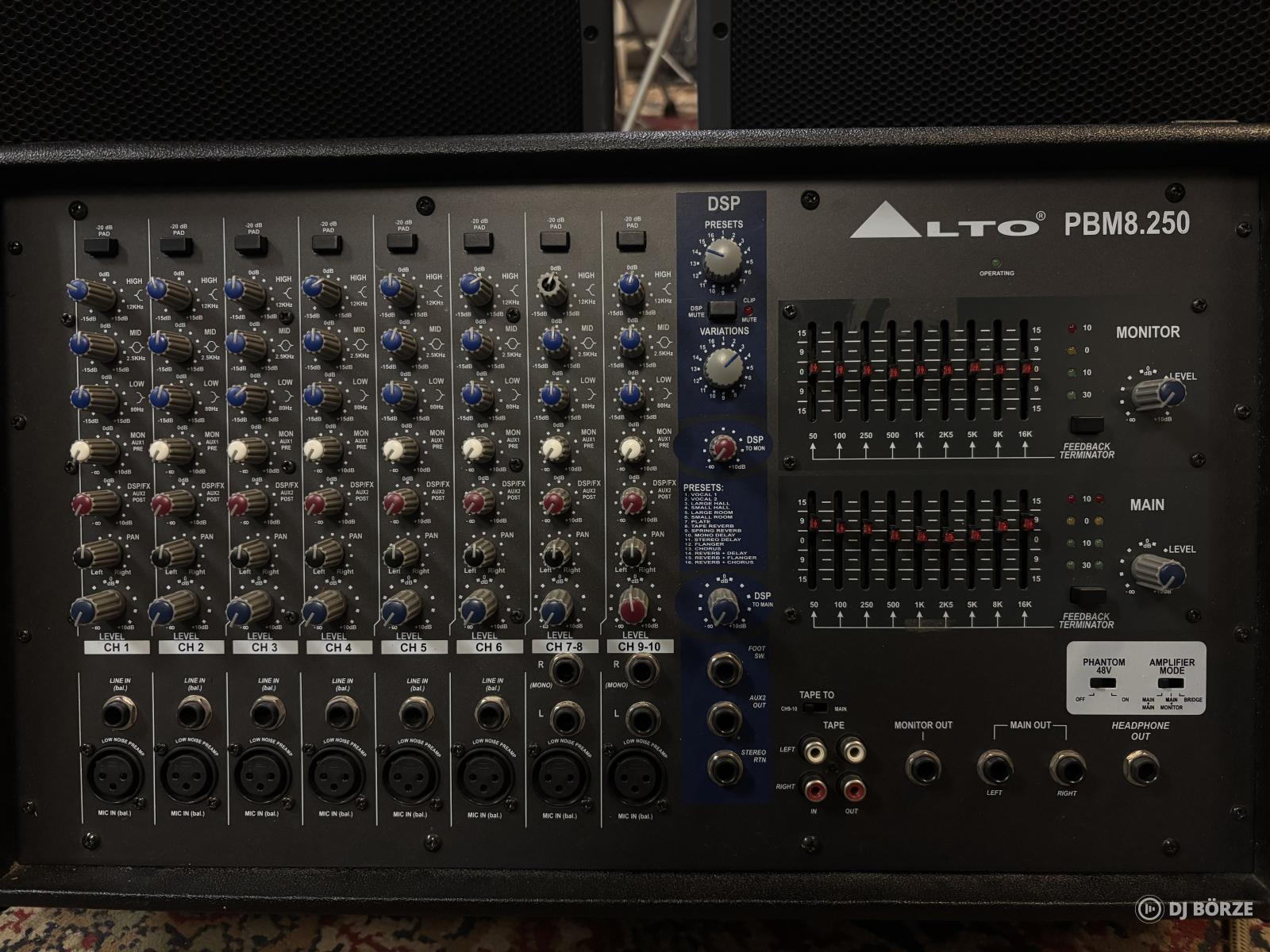 8 csatornás (6 mikrofon + 2 sztereó) keverő-erősítő, 2x250W RMS teljesítménnyel. Beépített 24-bites DSP effektprocesszorral, 9-sávos grafikus EQ-val és gerjedésgátlóval. Megbízható, recsegésmentes állapotban.