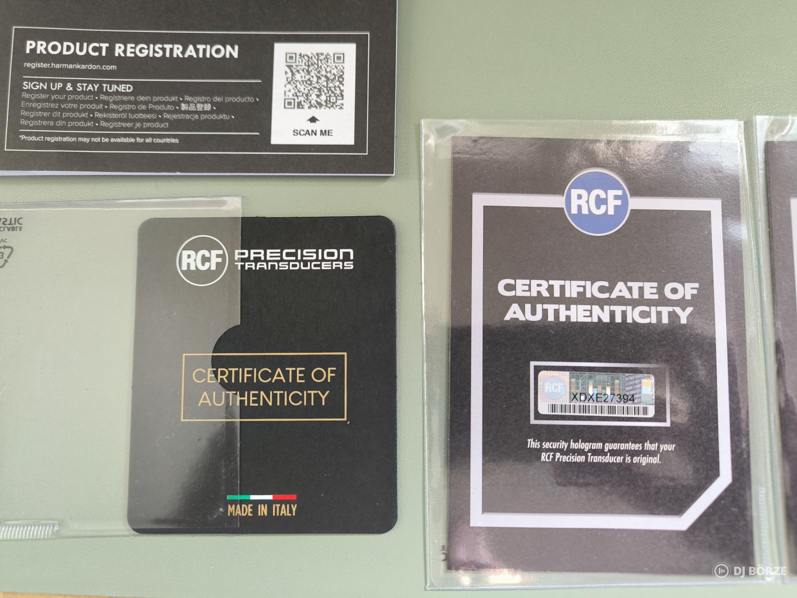Gyári RCF igazolványok, számla van, 1 éves a hangszóró, doboz teljesen új.