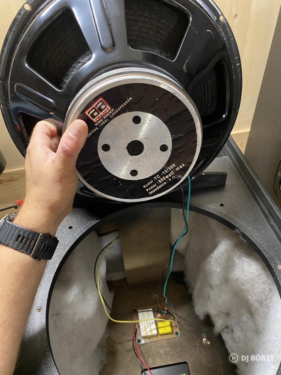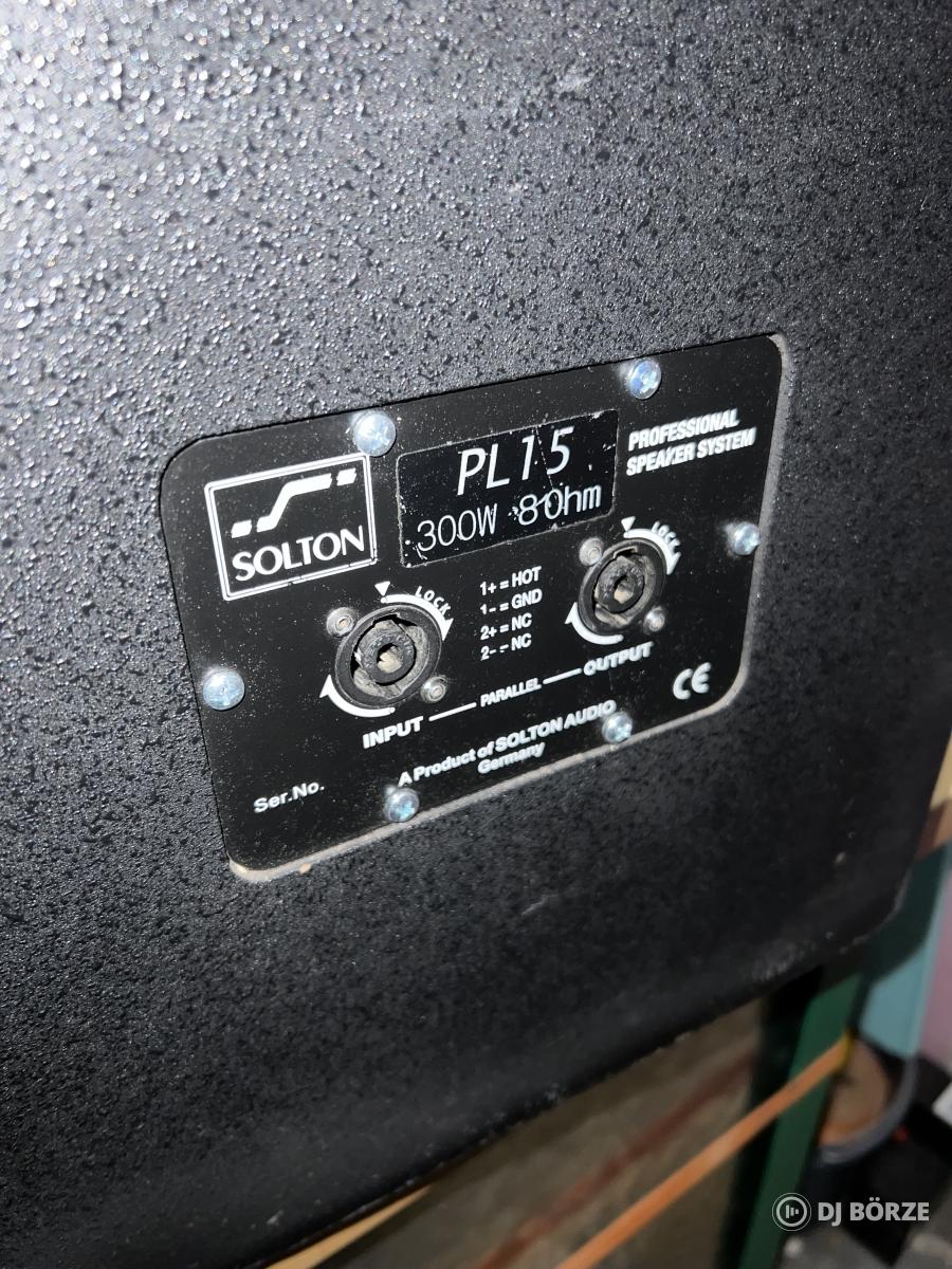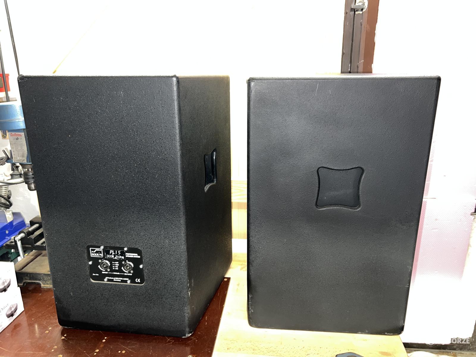 Fejlesztés miatt eladó egy pár szép állapotú Solton PL15 típusú, 300/600W, 8 ohm, 15”-os mélyszóróval (AA Craaft TC15/300 típus) szerelt fa topláda.