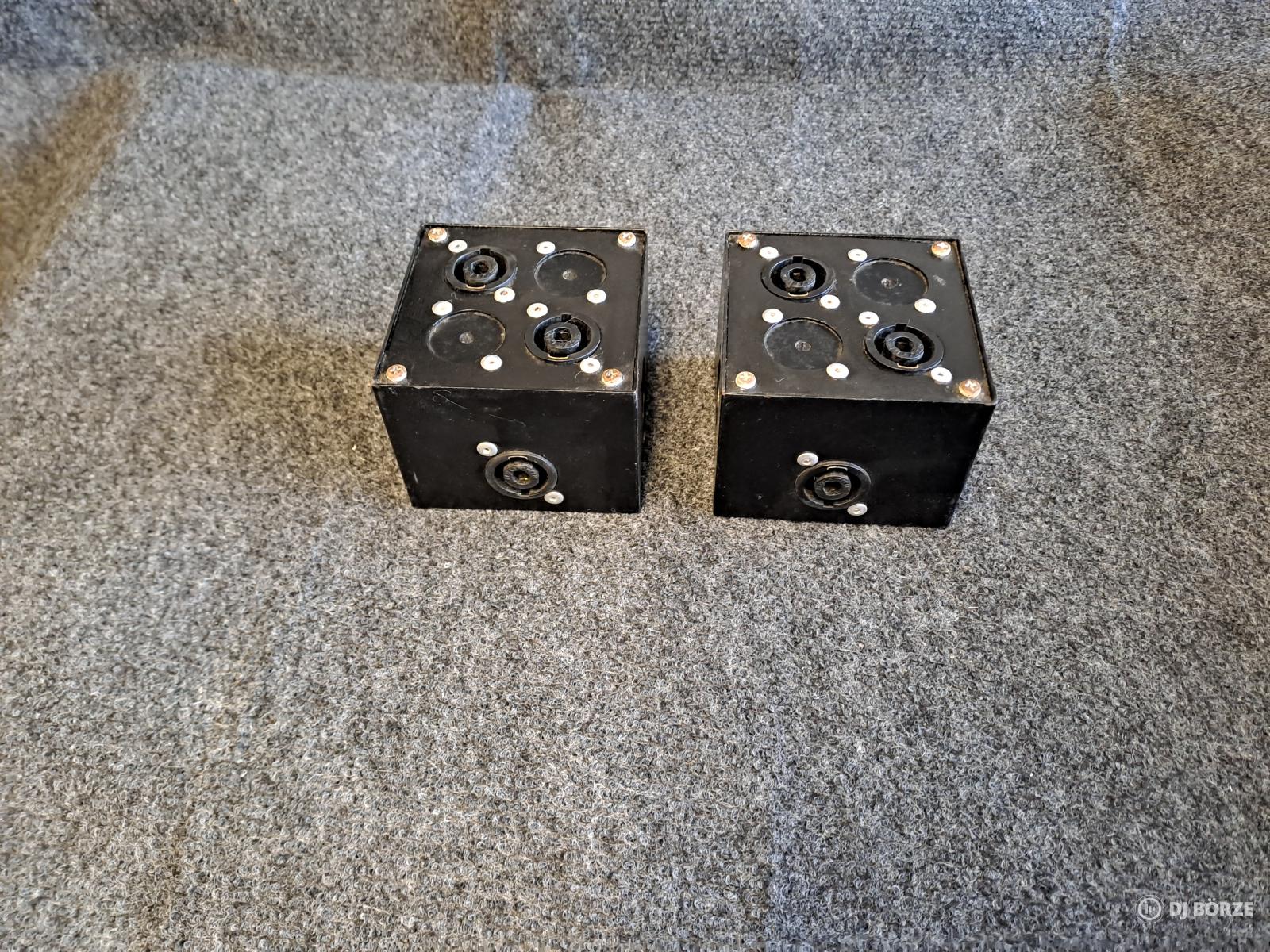 Eladó a fotón látható 2 db speakon kocka, 1 speakon csatlakozó jeléből kettőt csinál, párhuzamosít. Jó állapotú eszköz, neutrik aljzatokkal szerelve.