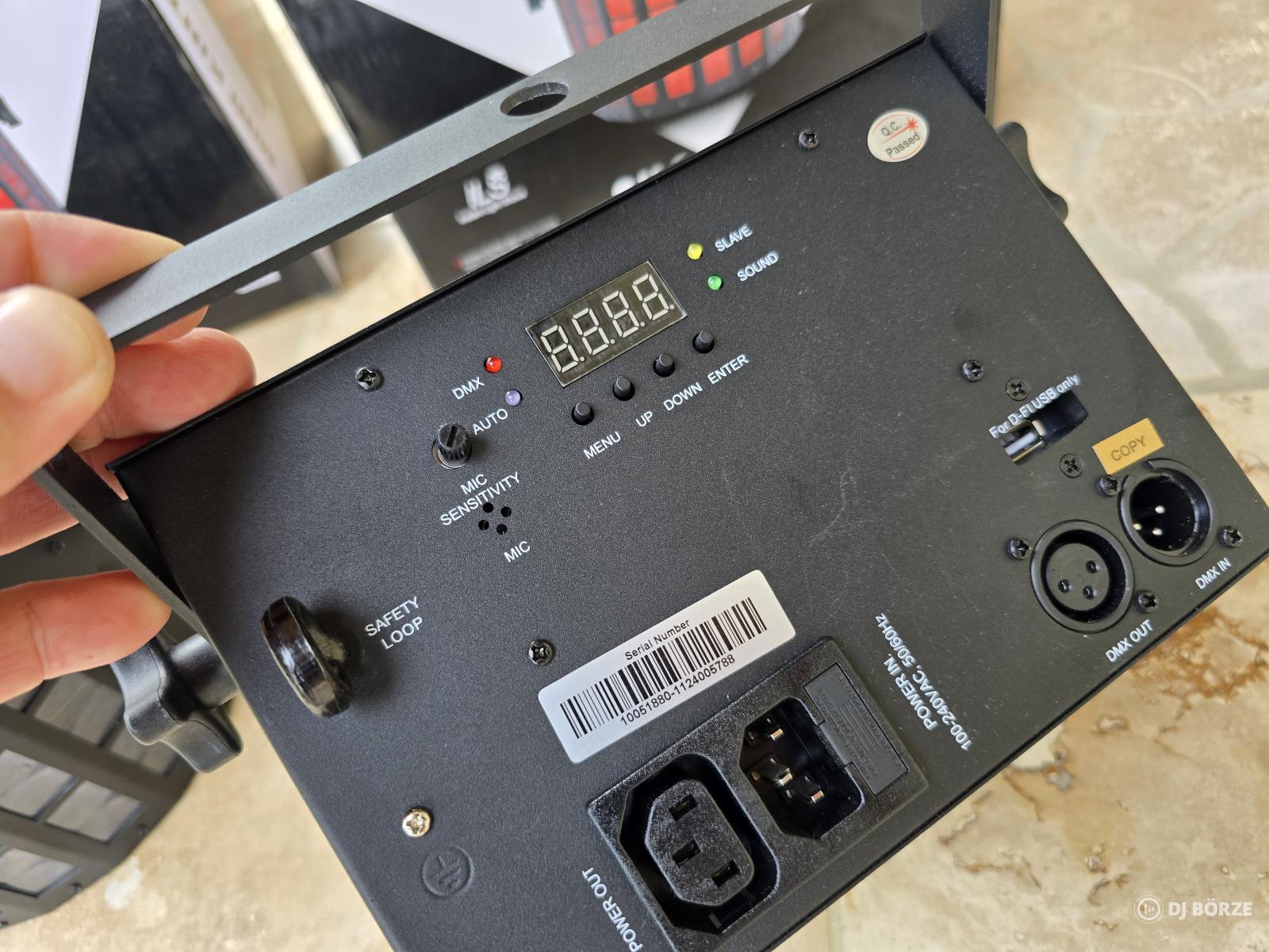 DMX csatlakozások: 3 tűs XLR