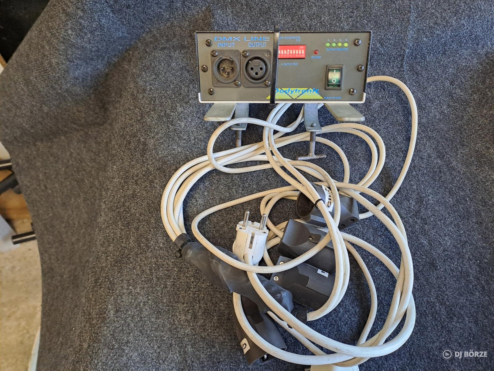 Eladó a fotón látható eszköz. DMX-es 4 csatornát lehet vele kapcsolni. A függesztő is tartozék, továbbá a bemeneti csatlakozó, kábelekkel, aljzatokkal.