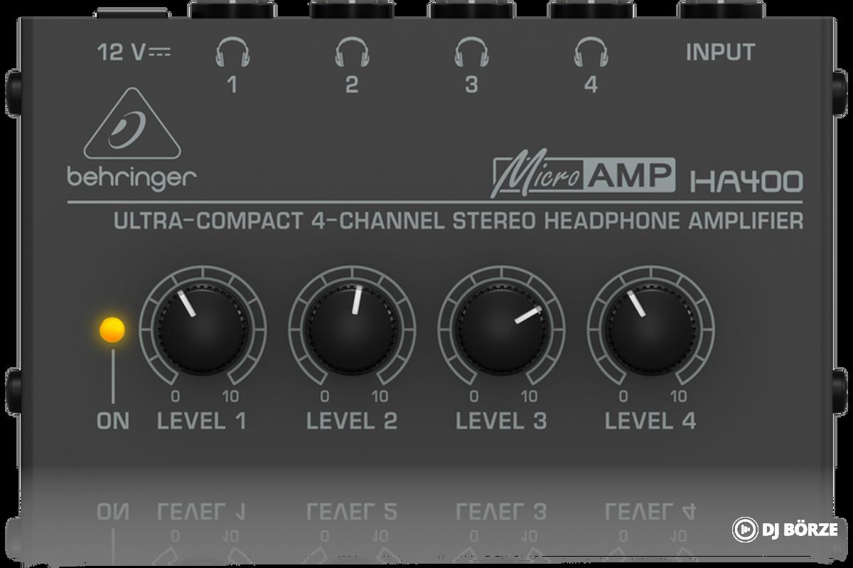 A Behringer HA400 1 db sztereó 6,35 mm-es jack bemenetet és 4 db független sztereó 6,35 mm-es jack kimenetet tartalmaz, csatornánkénti hangerőszabályzóval. A készülék DC 12 V adapterrel üzemel, amely a csomagban mellékelt. Kompakt, strapabíró mechanikus házzal készült. Az eszköz passzív elosztóként is működik, a beépített erősítő pedig kompenzálja a jelveszteséget több fejhallgató egyidejű meghajtásánál.