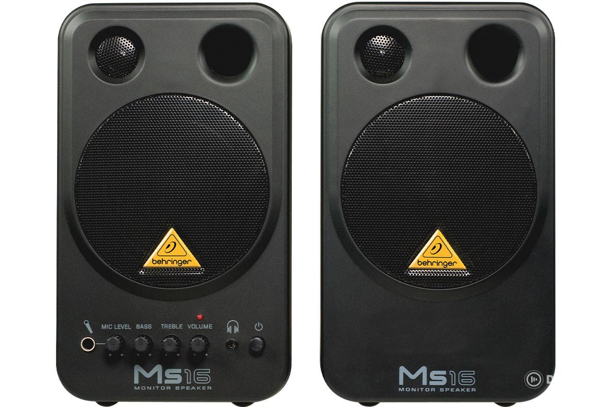 A Behringer MS16 kétútas aktív monitorpár összesen 16 W teljesítménnyel (2 × 8 W) rendelkezik. A hangfalak 3,5 mm-es sztereó AUX bemeneten keresztül csatlakoztathatók. A kompakt asztali kialakítás közvetlen monitorpozíciós elhelyezést tesz lehetővé. Az egység önálló hangerőszabályzóval van felszerelve.