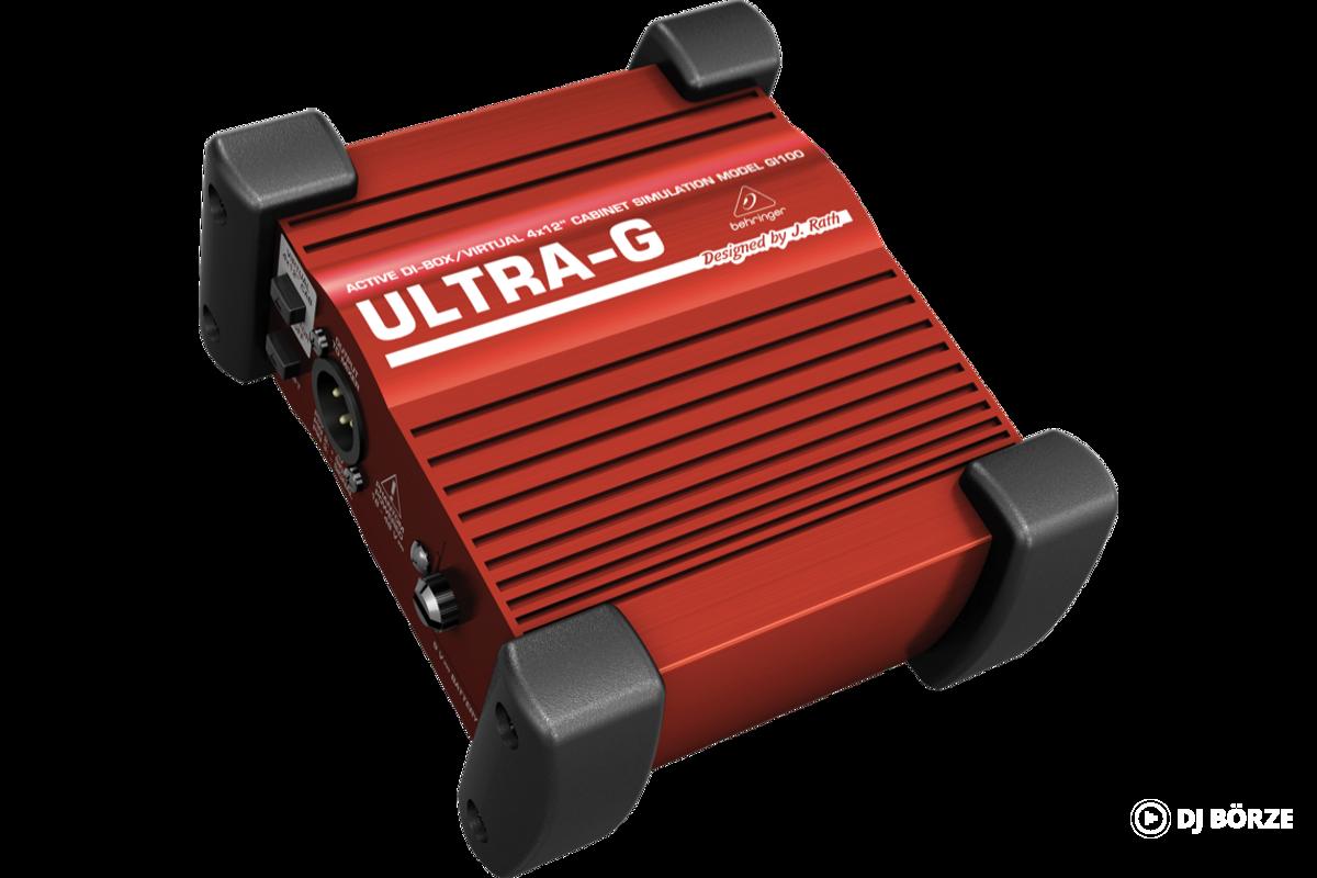 A Behringer Ultra-G GI100 aktív DI-box valódi hangszórószimulációs áramkört tartalmaz, amely egy mikrofonnal felvett gitárszekrény hangzását reprodukálja. 6,35 mm-es TS hangszer-bemenettel és kiegyensúlyozott XLR kimenettel rendelkezik. A ground lift kapcsoló megszünteti a földhurokból eredő zajokat, a –20 dB-es pad kapcsoló pedig megakadályozza a túlvezérlést. Az eszköz 48 V-os fantomtápról vagy 9 V-os elemről is tápellátható.