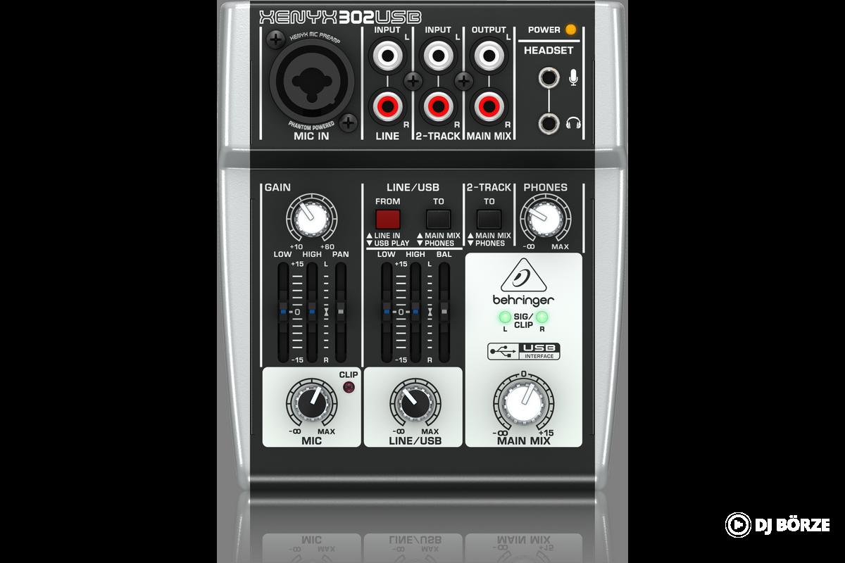 A 302USB egy mono csatornát (XLR és jack bemenettel) és egy sztereo csatornát (RCA és USB bemenettel) kínál. XENYX mikrofon előerősítőt tartalmaz kapcsolható phantom táppal (48 V). Neo-klasszikus brit jellegű 2 sávos EQ érhető el a mono csatornán. Vonal/USB jelválasztó kapcsoló, valamint fő kimenet és fejhallgató-kimenet választó vezérlők egészítik ki. Ingyenes Audacity szoftver jár hozzá 150 hangszer- és effekt plug-innel.