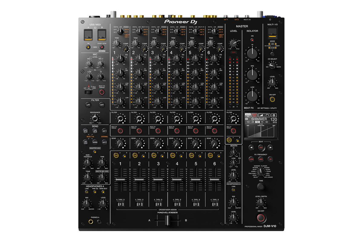 A DJM-V10 hat csatornás, 96 kHz/32 bites hangkártyával felszerelt professzionális DJ keverő. Csatornánként négysávos EQ (Low, Low-Mid, High-Mid, High) és dedikált Send/Return effekthurok áll rendelkezésre. Tartalmaz Beat FX és Sound Color FX processzort, valamint két USB csatlakozót egyidejű számítógépes kapcsolathoz. A keverő súlya kb. 11 kg, méretei: 418 × 148,9 × 426,7 mm. Minden csatornán több bemenet (Phono/Line/Digital) érhető el, a mestereken pedig XLR és RCA kimenetek találhatók.